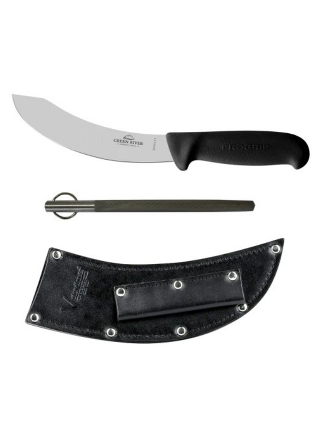 This set contains a Green River 15cm skinning knife, a sharpening steel & a leather sheath with belt loop.